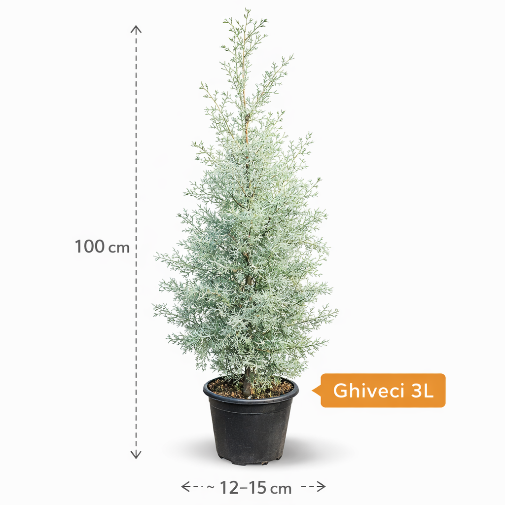 conifer elegant și modern, cu frunziș fin, argintiu-albăstrui, perfect pentru a adăuga structură și rafinament grădinii sau terasei tale. Aspectul său aerisit și culoarea distinctă îl transformă într-un punct de atracție în orice spațiu verde.
